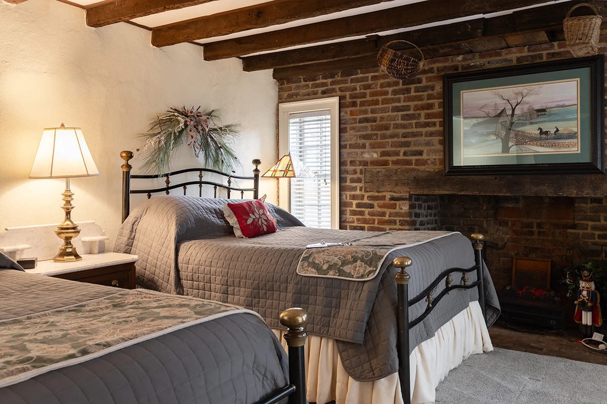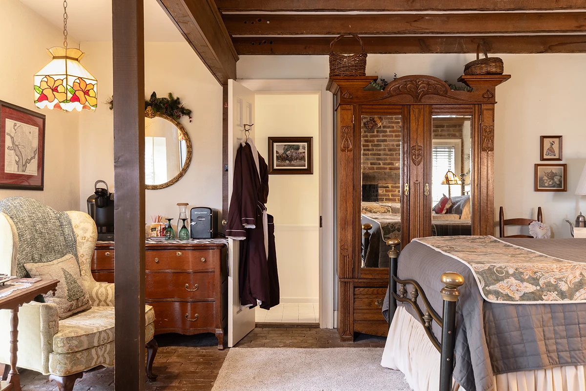 Located off of our beautiful courtyard, The Kitchen House features the original wood stove to the home. It has the original brick floor and is furnished with 2 queen size beds and a large bath with jetted tub. This room is not handicap accessible.