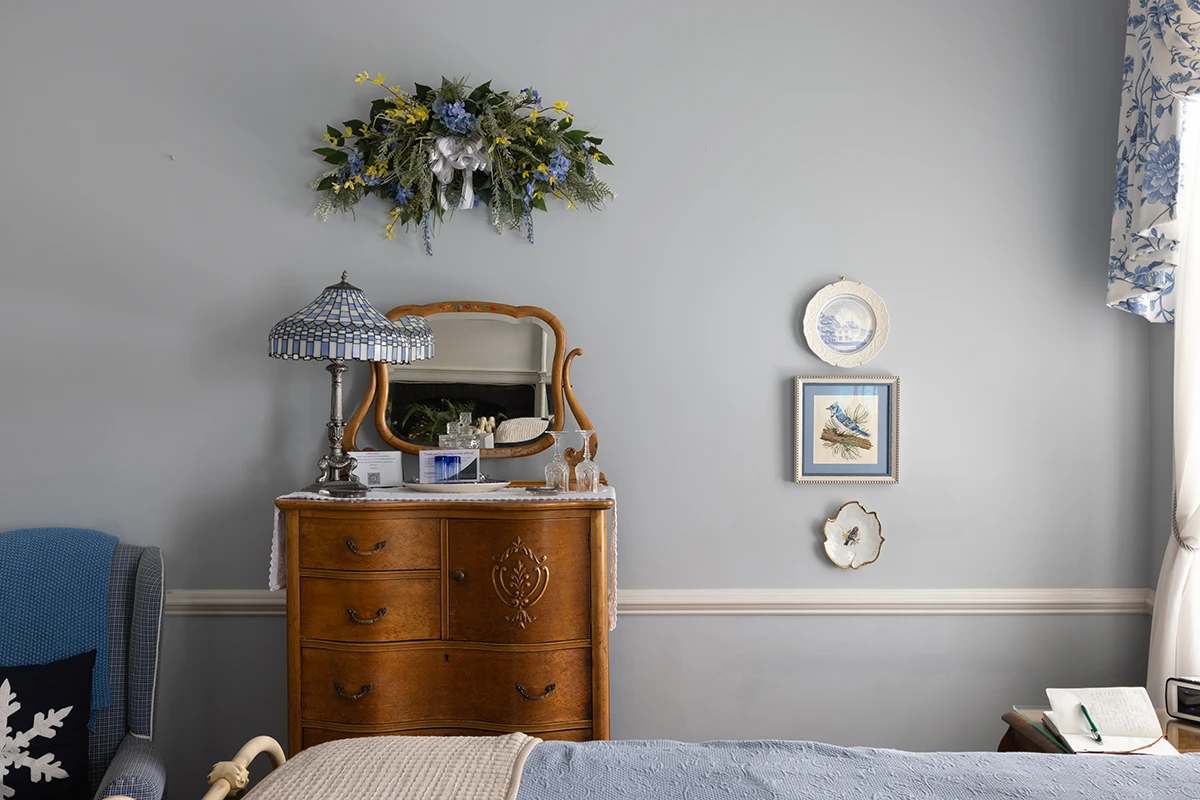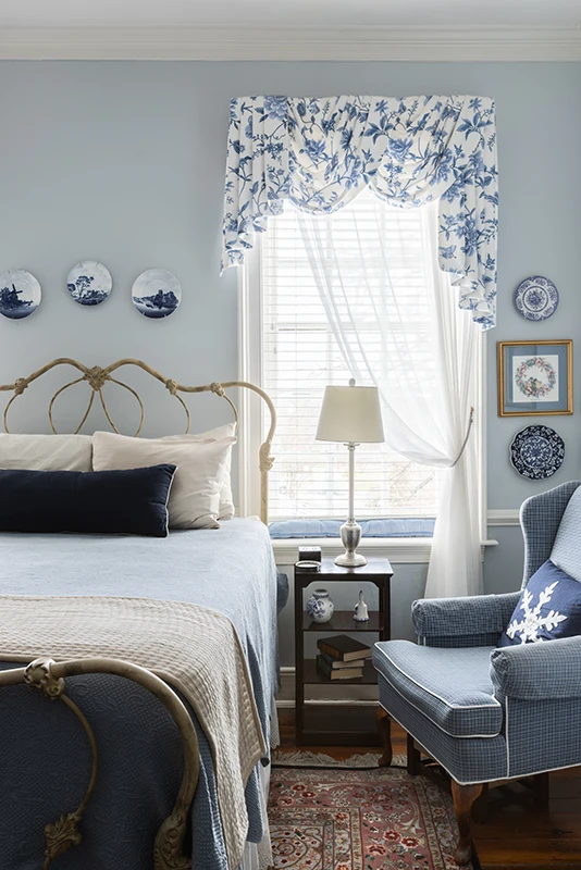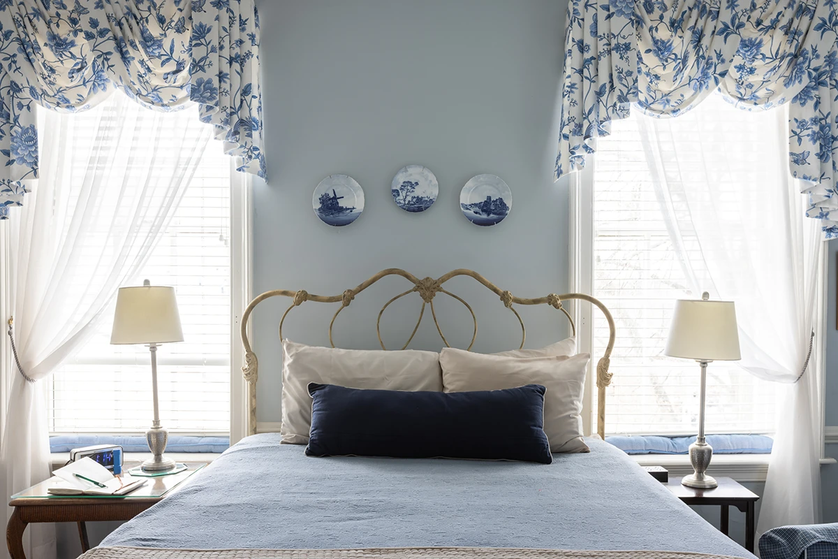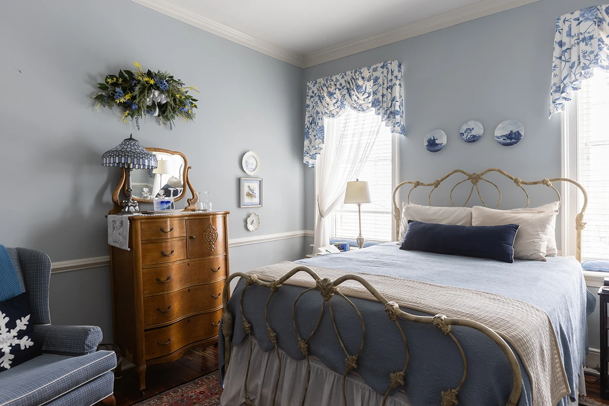 Decorated in blue and white, The Peyton Mae is a queen size bedroom that overlooks the courtyard. Guests of this room also enjoy a private, full bath with tub and shower combination located across the hall. This room is not handicap accessible.